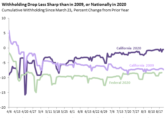 California employers are required to make regular income tax withholding payments for their employees, which can provide a real-time indication of the direction and magnitude of the aggregate change in the employers’ payrolls. Most withholding payments are for employees’ wages and salaries, but withholding is also due on bonuses and stock options received by employees. We caution against giving too much weight to withholding numbers in any given week because a single anomalous day can result in numbers that are difficult to interpret. Nonetheless, given the pace and severity of the shift in the state’s economy resulting from the COVID-19 pandemic, tracking weekly withholding is worthwhile as a way to assess the state’s rapidly changing economic situation.