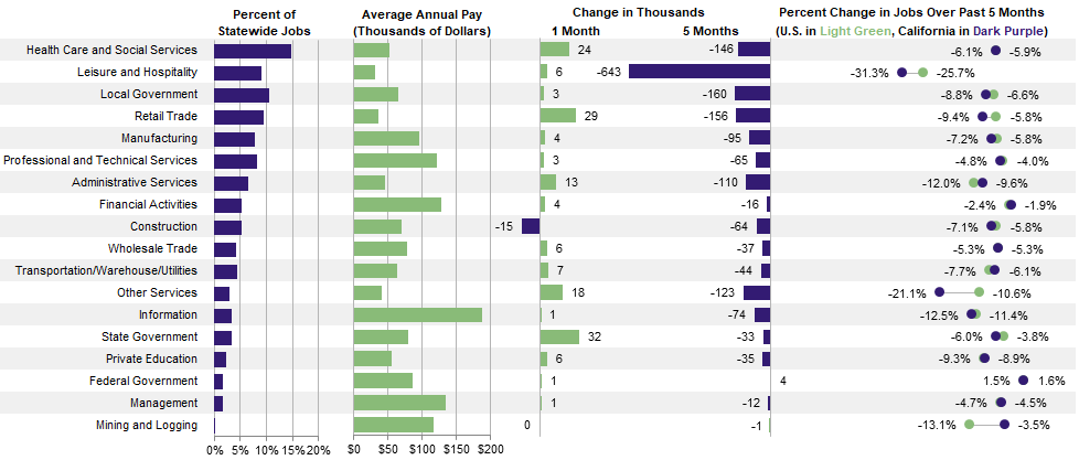 The figure below summarizes nonfarm employment by sector based on the monthly survey of employers. Overall employment in the state as of the middle of July was 10.3 percent below the level of February, somewhat worse than the national figure of 8.4 percent. California’s leisure and hospitality sector recovered fewer than 6,000 jobs in July compared to nearly 600,000 nationwide. Excluding this sector, the state accounted for 11.5 percent of July nationwide job growth, exactly in line with its share of total jobs in February.