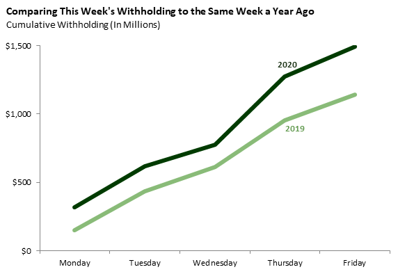 Bottom Line: California income tax withholding had a surprising surge this week, and total collections since late March are now 0.8 percent above the comparable period in 2019.