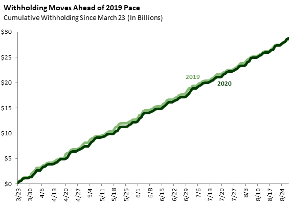 The second graph shows total withholding collections since Monday, March 23, when we first started to see evidence of an impact of the pandemic on withholding. As shown in the graph, total collections between March 23 and August 28 are up 0.8 percent ($216 million), the first time since this tracker was started that it has shown a net gain from 2019. Last week, the tracker showed a cumulative decline of 0.5 percent ($138 million).