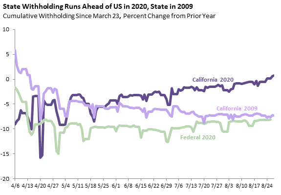 The final graph shows the year over year changes in cumulative withholding for California in 2020, the United States in 2020 (from the federal income tax), and California in 2009 at the trough of the Great Recession. California’s withholding picture has improved lately, unlike federal withholding this year or the state’s own withholding at the same stage in 2009. While California’s economy has been hurt at least as badly by the recession as the national economy has, its withholding collections have likely held up better because its income tax falls more heavily on the higher-paid workers who have experienced fewer employment losses than their lower-paid counterparts. Federal withholding this week was down 4 percent from 2019, and the comparable week in California in 2009 was down 9 percent from 2008.