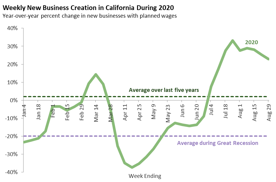 The graph below shows weekly data on business creation in California from the U.S. Census. New business creation crashed in late March and remained depressed through June. Beginning in July, however, business creation picked up notably, growing much faster than the recent historical average. This heightened level of business creation continued in August.
