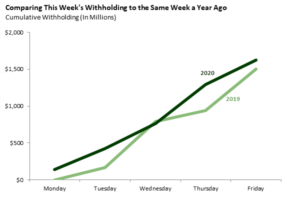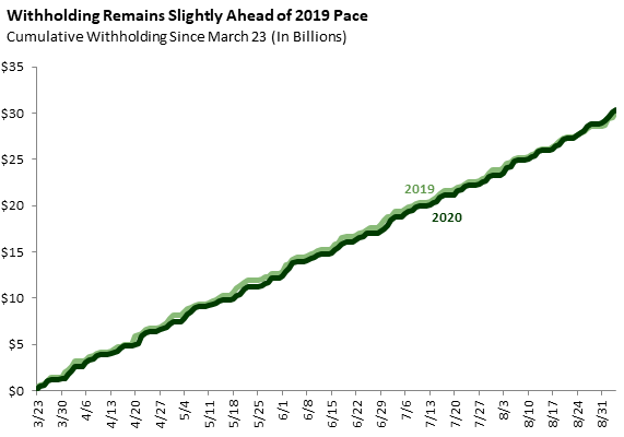 The second graph shows total withholding collections since Monday, March 23, when we first started to see evidence of an impact of the pandemic on withholding. As shown in the graph, total collections between March 23 and September 6 are up 1.1 percent ($336 million). Last week, the tracker showed an increase of 0.8 percent ($216 million).