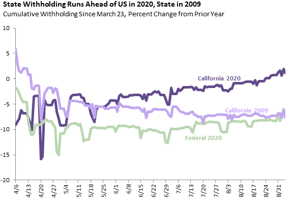 The final graph shows the year over year changes in cumulative withholding for California in 2020, the United States in 2020 (from the federal income tax), and California in 2009 at the trough of the Great Recession. California’s withholding picture has improved lately, unlike federal withholding this year or the state’s own withholding at the same stage in 2009. While California’s economy has been hurt at least as badly by the recession as the national economy has, its withholding collections have likely held up better because its income tax falls more heavily on the higher-paid workers who have experienced fewer employment losses than their lower-paid counterparts. Federal withholding this week was up 2 percent from 2019, and the comparable week in California in 2009 was down 14 percent from 2008.