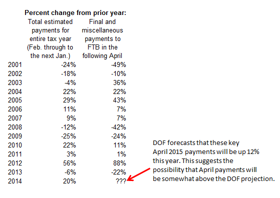 Looking Ahead to April 2015 PIT Collections. Total estimated PIT payments collected by FTB from February 2014 to January 2015 (generally representing projected tax liability for calendar year 2014) were up 20% from the same period of the previous year. As shown below, DOF now projects that "final" and "miscellaneous" payments in April 2015 will be up 12% from April 2014. Historically, the correlation between the growth rates of estimated payments and final payments to be received in April has been fairly loose, as suggested below. Still, the trend indicates the possibility that April 2015 PIT collections will be higher than DOF now projects.