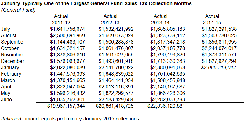 Data is now available concerning January 2015 California General Fund revenues, including collection of the "Big Three" state taxes, the state General Fund's major tax revenue sources (personal and corporate income taxes, as well as the sales and use tax [SUT]). January is one of the largest tax collection months each year, driven by (1) personal income tax (PIT) withholding on year-end bonus payments to high-income earners (2) each year's final set of PIT quarterly "estimated payments," largely related to high-income filers' capital gains and business income, and (3) collections of SUT related to holiday sales prior to the new year's start.