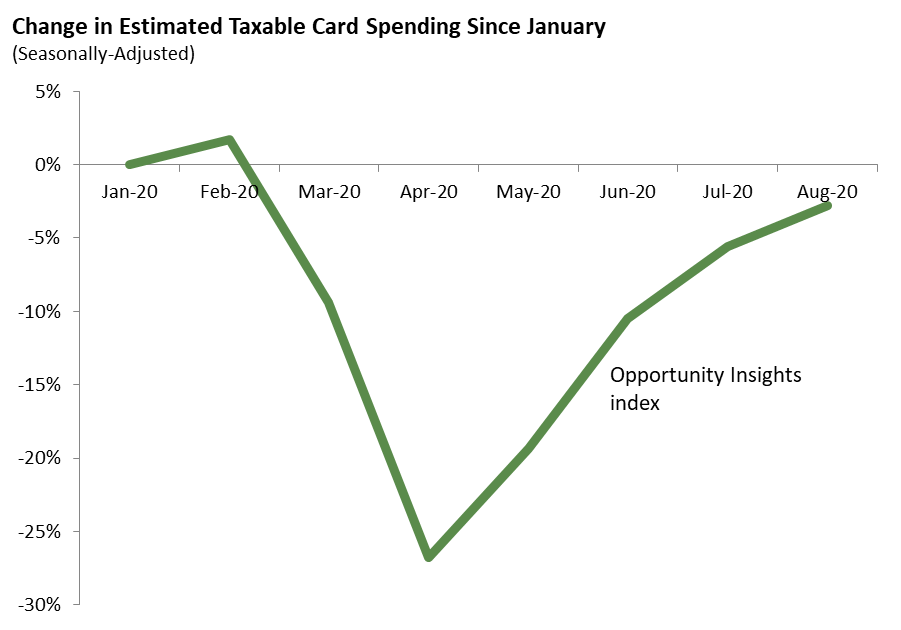 As described in an earlier post, we are using credit and debit card spending data provided by Opportunity Insights to track sales tax trends in California. To do this, we use an index—a weighted average of different spending categories—designed to track movements in California’s sales tax base. In this post, we update the index to include August data.