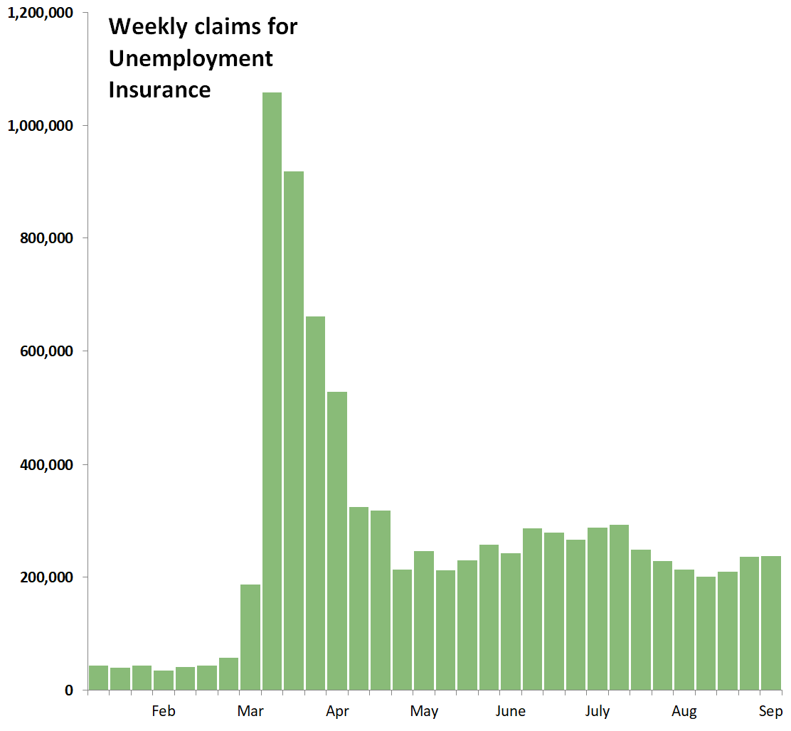 Claims for Unemployment Insurance Remain Elevated. California processed 237,516 claims for regular unemployment insurance between August 30 and September 5. This amount is generally consistent with levels seen since the initial pandemic workload peaked and then subsided in late March and early April.