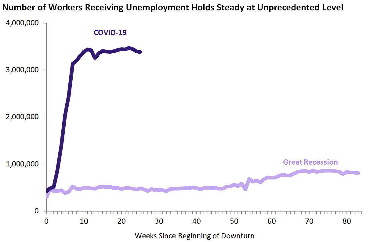 Regular Continued Claims Hold Steady at 3.4 Million. As of September 5, California had 3.4 million employees receiving regular unemployment benefits, roughly level with the recent peak. As shown in the figure, this level far exceeds the number of workers who received unemployment benefits during the Great Recession.