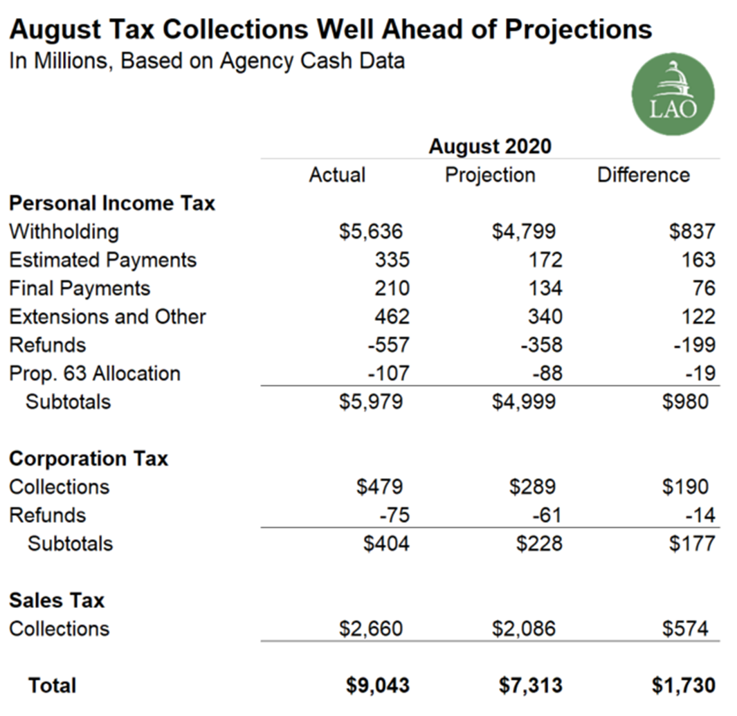 August revenue collections from the state’s three largest taxes—the personal income tax, corporation tax, and sales tax—were ahead of budget projections by $1.7 billion (24 percent). Personal income tax withholding and sales tax receipts continue to be key drivers of the better-than-expected collections. As we discussed last month, strong performance in withholding appears to be tied to relatively stable employment among high-wage earners. Better-than-expected sales tax collections are consistent with the rapid rebound in consumer spending in recent months.