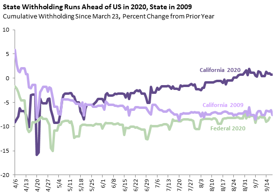 The final graph shows the year over year changes in cumulative withholding for California in 2020, the United States in 2020 (from the federal income tax), and California in 2009 at the trough of the Great Recession. California’s withholding picture has improved lately, unlike federal withholding this year or the state’s own withholding at the same stage in 2009. While California’s economy has been hurt at least as badly by the recession as the national economy has, its withholding collections have likely held up better because its income tax falls more heavily on the higher-paid workers who have experienced fewer employment losses than their lower-paid counterparts. Federal withholding this week was down 2 percent from 2019, and the comparable week in California in 2009 was down 6 percent from 2008.