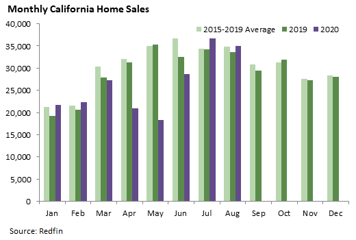Home sales can be a good indicator of the health of the state’s economy and housing markets. California home sales were running at a relatively high level early in the year, then dropped sharply as a result of the COVID-19 pandemic before recovering in the summer. August’s total of 34,963 was right in line with the August average from 2015 to 2019. As July sales were also healthy, it appears that the state’s housing market has returned to normal, with the boost from lower mortgage rates roughly offsetting the drag from depressed economic activity. The graph below shows unadjusted home sale counts according to Redfin, a national real estate brokerage. Sales are booked when they close, so monthly counts primarily reflect contracts that were signed in the previous month.