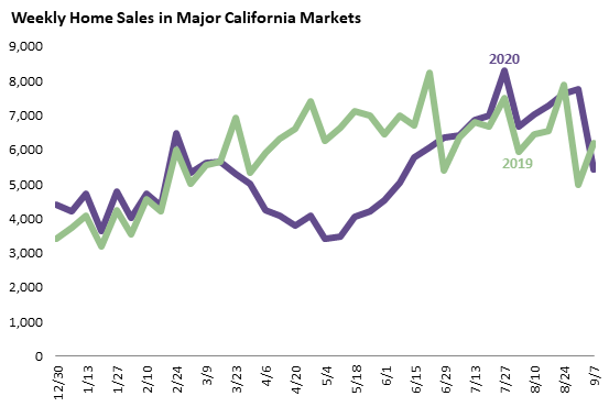 This next graph shows weekly counts for 2019 and 2020 using Redfin data for California’s twelve largest markets. The graph suggests that home sales gained momentum in the first half of September. The dip in the most recent week likely reflects the timing of Labor Day this year, as sales volume over the past two weeks combined ran well ahead of the same weeks in 2019.