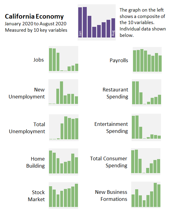 We display each variable as a standardized index that shows how the current level of each variable compares to historic norms. At the top of the graphic, we aggregate the ten variables into a single measure that attempts to capture what changes in the individual variables can tell us about the overall trend in the state’s economy. As this measure shows, California’s economy experienced a precipitous drop in March and April. Beginning in May, however, economic activity began to recover. This recovery has continued through August.