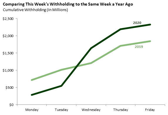 Bottom Line: Thanks to a huge day on Wednesday, California income tax withholding collections this week were 27 percent above the comparable week in 2019. Total withholding since late March increased to 3.5 percent above the same period last year.