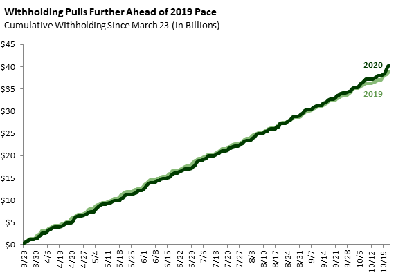 The second graph shows total withholding collections since Monday, March 23, when we first started to see evidence of an impact of the pandemic on withholding. As shown in the graph, total collections between March 23 and October 23 are up 3.5 percent ($1.365 billion) from the same period in 2019. Last week, the tracker showed an increase of 2.4 percent ($876 million).