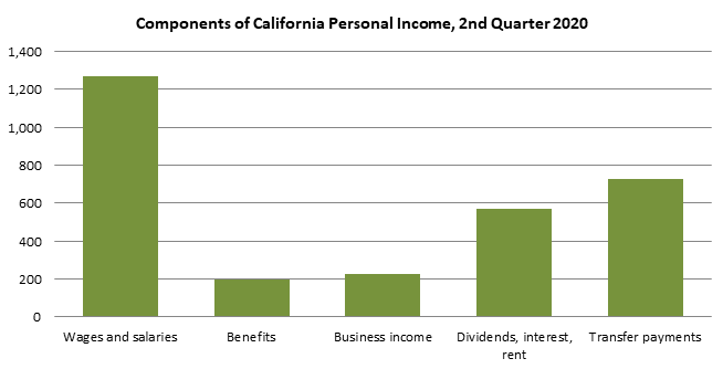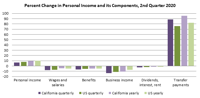 The next chart shows the growth rates of the various categories of personal income over the past quarter and the past four quarters for both California and the United States. The state’s growth rate of 6.5 percent from the first quarter to the second quarter was the fastest since at least 1948, but it stemmed entirely from an unprecedented 88.9 percent increase in transfer payments. An increase in the number of people on regular state unemployment insurance (UI), a temporary federal increase of $600 per week for UI recipients, and the one-time $1,200 federal stimulus checks all contributed to the rise in transfers. The other four income categories all fell. Business income endured the sharpest decline at 13.8 percent, and would have fallen further if not for the federal Paycheck Protection Program loans. The national decline in business income was somewhat smaller at 11.4 percent. Wages and salaries fell slightly more in California (8.0 percent) than nationally (7.2 percent).