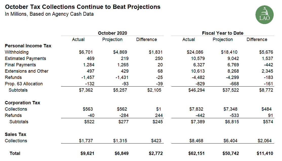 October revenue collections from the state’s three largest taxes—the personal income tax, corporation tax, and sales tax—were ahead of budget projections by $2.8 billion (40 percent). Tax collections have been coming in well ahead of projections for several months. As a result, total collections for 2020-21 are $11.4 billion (22 percent) ahead of budget expectations. Next week, we will release our annual Fiscal Outlook, which will discuss the implications of these better-than-expected collections for the state’s revenue outlook in the coming months and years.