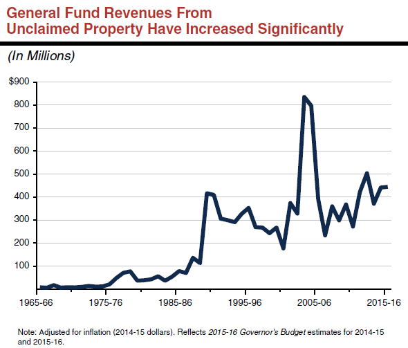 Unadjusted for inflation, the General Fund unclaimed property revenues were $258 million in 2002-03 before spiking to $669 million in 2003-04 and $658 million in 2004-05 due largely to a decision to accelerate the schedule for selling securities in the program. In 2006-07 General Fund revenues from the program totaled $205 million, and they have generally grown since then, albeit with some year-to-year volatility as indicated in the figure displayed above. The 2015-16 Governor’s Budget estimates that these "abandoned property" revenues—including interest assessments—will be $442 million in 2014-15 and $452 million in 2015-16.