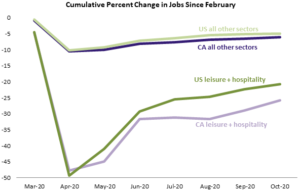The figure below shows how employment has evolved in both the state and the nation since the start of the pandemic. Overall employment in the state as of the middle of October was 8.4 percent below the level of February, somewhat worse than the national figure of 6.6 percent. More than a third of the gap is attributable to the leisure and hospitality sector which includes restaurants, bars, and hotels. Aggregate employment in other sectors has also recovered more slowly in the state than in the nation as a whole.