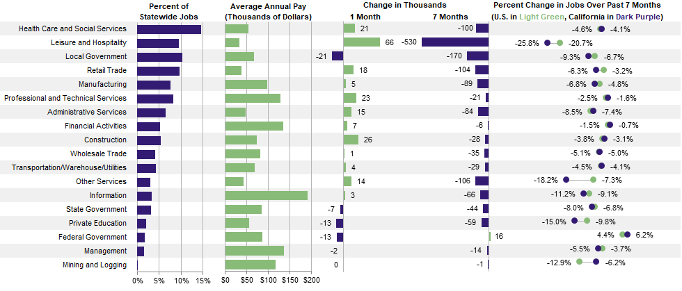 The next figure summarizes nonfarm employment by sector based on the monthly survey of employers. While the state’s hard-hit leisure and hospitality sector again recovered the most jobs, other sectors including construction, professional/technical services, and health care also recorded impressive gains.