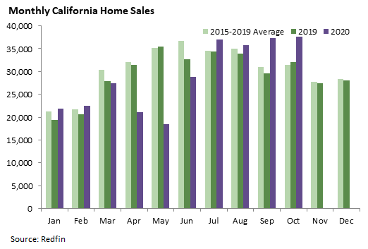 Home sales can be a good indicator of the health of the state’s economy and housing markets. California home sales have rebounded strongly since the pandemic-driven plunge in the spring, with the last four months showing the biggest aggregate sales volume of any four-month period since at least 2011. It appears that the boosts from historically low mortgage rates and possibly the increased emphasis on working from home are outweighing the drag from depressed economic activity. The graph below shows unadjusted home sale counts according to Redfin, a national real estate brokerage. Sales are booked when they close, so monthly counts primarily reflect contracts that were signed in the previous month.