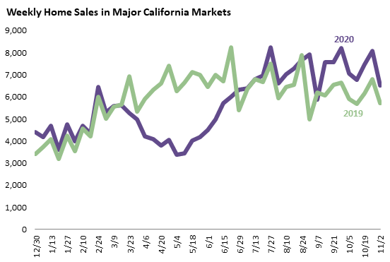 This next graph shows weekly counts for 2019 and 2020 using Redfin data for California’s twelve largest markets. The eight-week period ending in the first week of November showed a strikingly similar pattern to the same period in 2019, but with much higher overall sales volumes.
