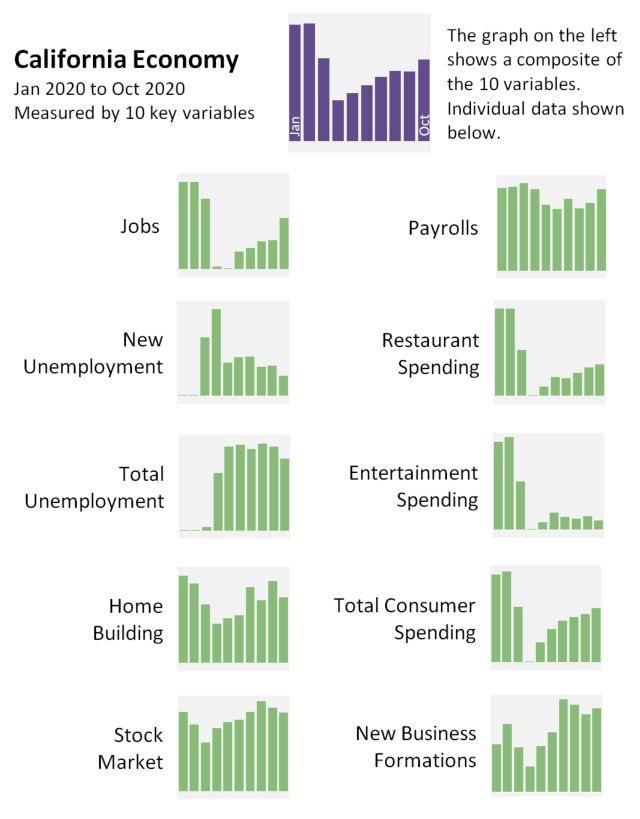 As this measure shows, California’s economy experienced a precipitous drop in the spring, followed by a rapid rebound. The indicators suggest the pace of the recovery slowed in August and September. October data, however, suggest another major positive jump in the state’s economic situation, but there are reasons to interpret this apparent uptick with caution. In particular, a key driver in the uptick is a large increase in employment. According to the official survey, California’s total employment jumped almost 900,000 in October, 40% of the entire national increase and the single largest monthly increase since the recovery began. Most of this increase is attributed to self-employed workers and independent contractors. While it is possible that California really did see a dramatic employment increase in October, it is important to note that the monthly employment estimates are noisy and subject to measurement error. The actual increase was likely below 900,000.