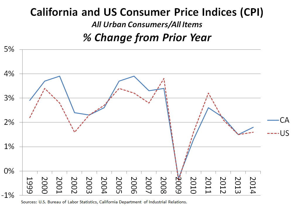California CPI Up Slightly Faster Than U.S. in 2014. As shown below, annual average trends in the California CPI have tended to track the U.S. CPI measure, with California's measure of price inflation typically slightly above that of the U.S. in strong economic times and at or below the U.S. measure in some weaker years for the economy recently. For 2014 as a whole, the U.S. CPI for all urban consumers was up 1.6%, slightly less than the California CPI growth rate. Due largely to declines in volatile oil prices, prices fell in the U.S. during the closing months of 2014. As we described recently, such low rates of inflation bring certain benefits to consumers, but also pose risks for the economy as a whole.