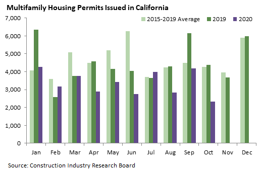In contrast, the multifamily housing permit total of 2,339 was the lowest monthly total since January 2017, the lowest October total since 2011, and the third straight month that was at least 30 percent below the same month in 2019.