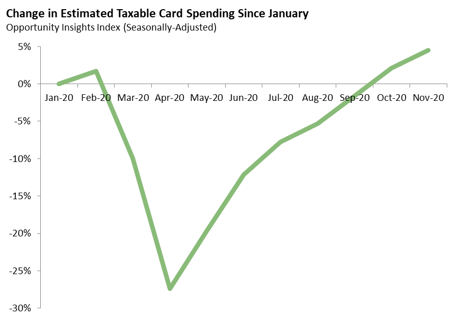 Card Data: Growth Continued in November. In November 2020, the spending index grew for the seventh month in a row, increasing by 2.4 percent from October to November (seasonally adjusted).