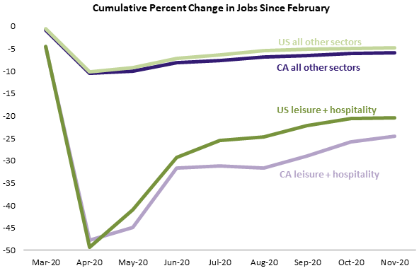 The figure below shows how employment has evolved in both the state and the nation since the start of the pandemic. Overall employment in the state as of the middle of November was 8.0 percent below the level of February, somewhat worse than the national figure of 6.4 percent. About a quarter of the gap is attributable to the leisure and hospitality sector which includes restaurants, bars, and hotels. Aggregate employment in other sectors has also recovered more slowly in the state than in the nation as a whole.