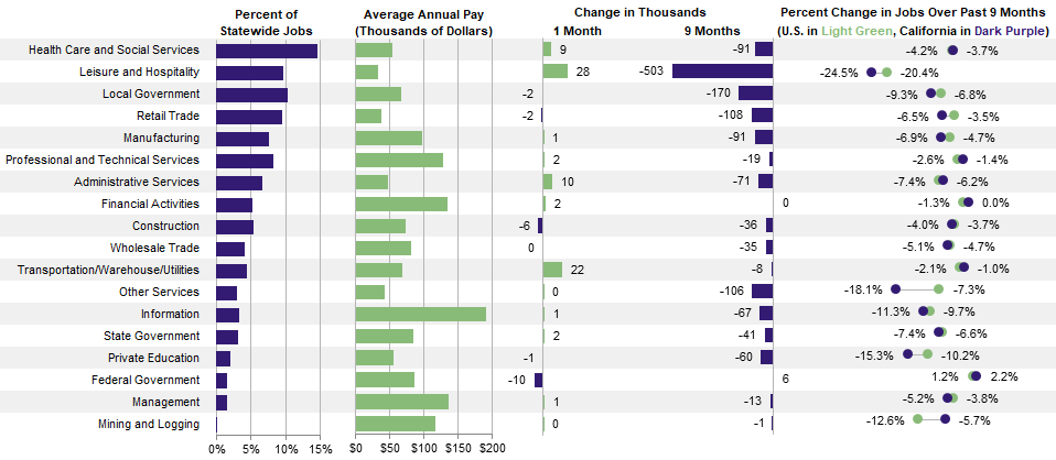 California's Employment Development Department and the U.S. Bureau of Labor Statistics released California's November 2020 state jobs report today. Statewide nonfarm employment rose by an estimated 57,100 in November, the smallest increase since the labor market began to recover in May. The official unemployment rate dropped from 9.0 percent in October to 8.2 percent in November, but remains far above the estimate of 3.9 percent in February before the COVID-19 pandemic caused large-scale upheavals. The survey reflects job changes through the week of November 8 to November 14. California accounted for 23.3 percent of the national estimate of 245,000 net jobs gained in October, more than double its 11.5 percent of the nation’s total payroll jobs as of February.