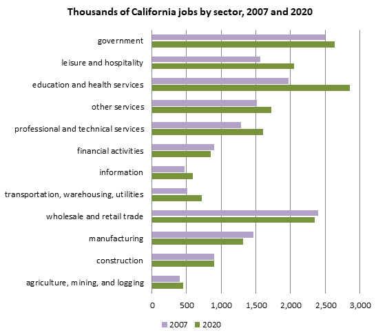 California’s relatively strong job growth from 2007 to early 2020 was driven to some extent by the extraordinary growth of its emerging information subsectors. The state’s fortunes over the next cycle will depend in part on whether these industries can maintain their rapid growth in the state in the face of a potential long-term shift to remote work.