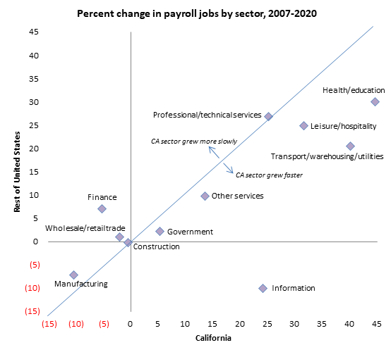 The next chart shows how California’s sectors compared to their counterparts in the rest of the nation between July 2007 and February 2020. The distance from the diagonal line shows the difference between the sector’s growth rate in the state and its growth in the rest of the country. Overall, California employment grew 13.5 percent over the cycle, slightly above the rest of the nation’s growth rate of 12.8 percent. The state’s information, health/education, leisure/hospitality, and transportation/warehousing/utilities sectors grew considerably faster than the same sectors in other states, while its manufacturing and finance sectors performed noticeably worse. The most striking result is in the information sector, which grew rapidly in California but declined more than any other sector in the rest of the country.