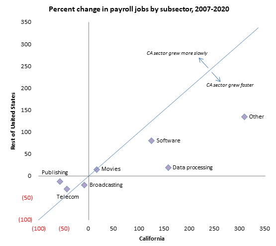 The final chart compares job growth in California’s information subsectors to their counterparts in other states. The three subsectors that grew most impressively in California saw smaller increases elsewhere. Conversely, the publishing and telecommunications subsectors fell less sharply in the rest of the country. The high-growth subsectors were already overrepresented in California in 2007, and they then outperformed the same subsectors in other states over the next 12+ years, which drove the strong growth of the state’s aggregate information sector.