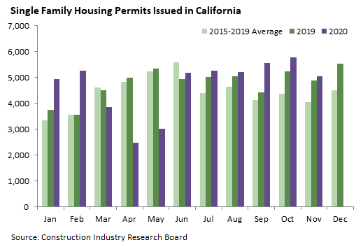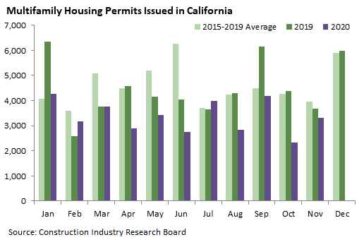 California recorded 8,368 housing permits in November, down 2 percent from November 2019 and in line with the 2020 average of about 8,000 units per month.