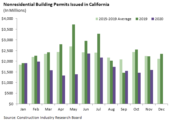 Nonresidential construction permit activity remains very weak. The November total of $1.596 billion was well below both the 2019 figure and the recent average for November. The bright spot in November was the industrial category, which posted a record high (not adjusted for inflation) of $398 million led by large projects in Oxnard, Visalia, and Chino.
