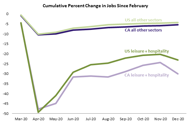 The figure below shows how employment has evolved in both the state and the nation since the start of the pandemic. Overall employment in the state as of the middle of December was 8.3 percent below the level of February, somewhat worse than the national figure of 6.4 percent. Nearly half the gap is attributable to the leisure and hospitality sector which includes restaurants, bars, and hotels. This sector took a sharp tumble between early November and early December as the pandemic worsened, and the effect was especially acute in California. Aggregate employment in other sectors rose in December, and California closed some of the gap with the rest of the nation.