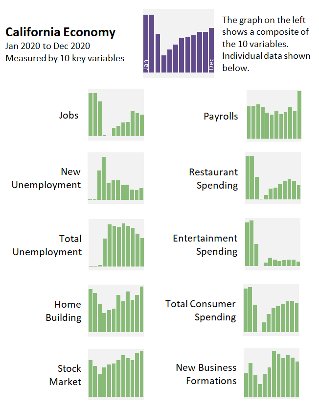 Bottom Line: December data was emblematic of the state’s uneven economic recovery from the pandemic. Measures tied to the prospects of higher-income Californians reached record highs, yet unemployment remains widespread and many households continue to cut back spending.