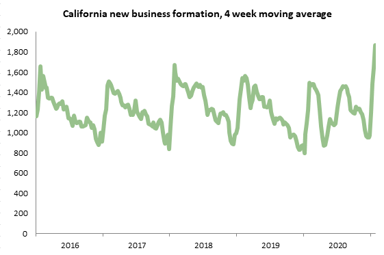 The next graph below shows the four-week average growth rate in 2020 relative to the same week in 2019. The pace of new business creation has run well ahead of 2020 since July, and accelerated in January as the first week of the year saw more than 3.5 times as many new firms created as the same week in 2020 did.