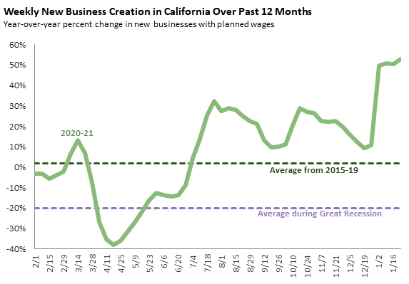 The extent of new business creation in California can be a useful gauge of the health of the state’s economy. Past research suggests that new businesses account for a sizable share of job creation and also are more sensitive to swings in economic conditions than older businesses. Our own analysis of business formation data in California suggests that it typically has been a leading indicator of changes in unemployment.