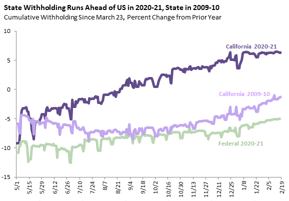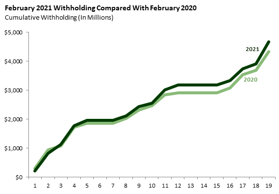 Bottom Line: California income tax withholding collections in February to date are 7.8 percent above February 2020. Total withholding since late March is 6.4 percent above the same period in 2019-20.