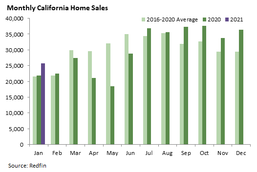 Home sales can be a good indicator of the health of the state’s economy and housing markets. California home sales have rebounded strongly since the pandemic-driven plunge in the spring. January marked the fifth straight month that sales were at least 15 percent above the recent average for the month, and the total of 25,679 sales was the highest January figure since at least 2012. It appears historically low mortgage rates and possibly the increased emphasis on working from home have caused a boom in home sales despite the continued weakness in overall economic activity. The graph below shows unadjusted home sale counts according to Redfin, a national real estate brokerage. Sales are booked when they close, so monthly counts primarily reflect contracts that were signed in the previous month.