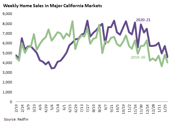 This next graph shows weekly counts for the past 52 weeks using Redfin data for California’s twelve largest markets. Strong sales growth continued into early February, although the market may be cooling a bit as the two most recent weeks showed a lower 12-month growth rate than any of the previous eight weeks did.