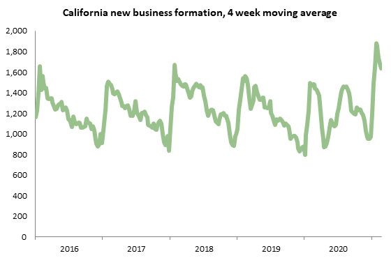 This graph shows U.S. Census data for the four-week average of new business creation since 2016, considering only those businesses that report having planned wages as opposed to shell corporations or holding companies. The standard pattern within a year is for a surge of new business formation at the beginning, then gradual declines as the year goes on. This pattern was upended in 2020: the pandemic caused a big drop in the spring, followed by a surge as the economy began to recover. Overall, new business creation in 2020 was a bit above 2016, 2017, and 2019 and somewhat below 2018. So far 2021 has seen a bigger than usual January spike, and the February level was also well above the recent average.