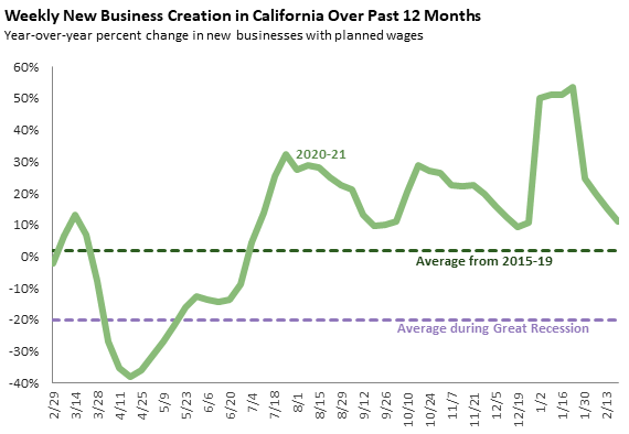The next graph below shows the four-week average growth rate in 2020-21 relative to the same week in 2019-20. Growth in new business creation has been heightened since last July. While the massive surge in new business creation we saw in January has not been sustained, activity in February continued to outpace 2020.