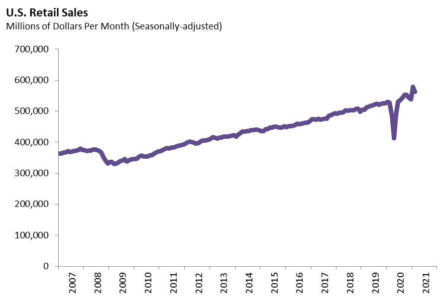 Today the U.S. Census Bureau released preliminary estimates of nationwide retail sales in February 2021 and revised estimates for January 2021. (The data include both brick-and-mortar and Internet sales.)