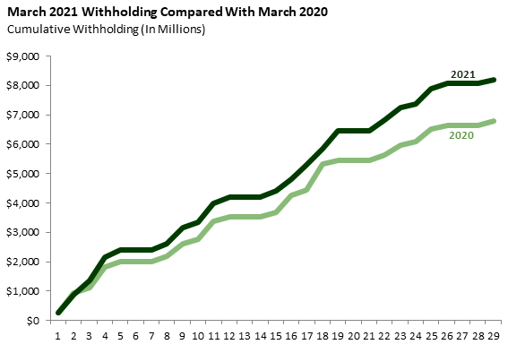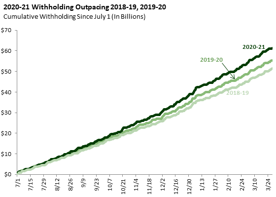 The second graph compares total withholding collections to date in fiscal year 2020-21 (which started on July 1, 2020) to the two previous years. As of March 29, cumulative collections were $6.1 billion (11.0 percent) ahead of 2019-20 and $9.8 billion (19.1 percent) ahead of 2018-19.
