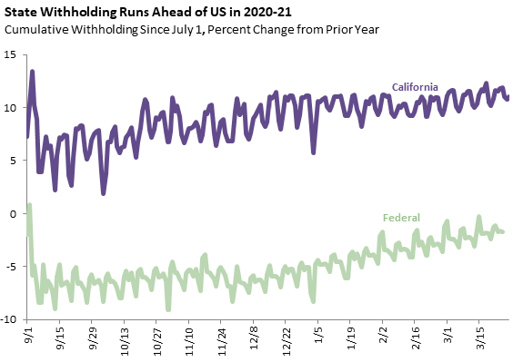 Bottom Line: California income tax withholding collections in March to date are 20.3 percent above March 2020. Total withholding to date in fiscal 2020-21 is 11.0 percent above the same period in 2019-20.